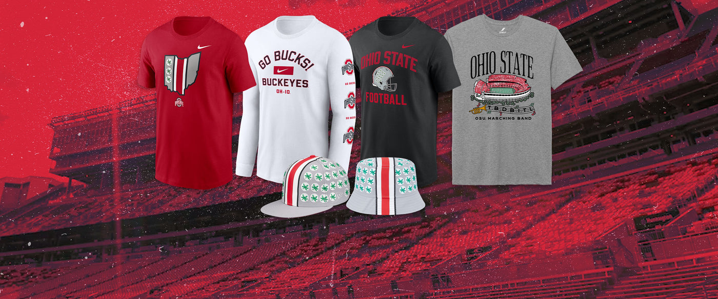 Gear up in Helmet Stripe colors @ the Shoe on Saturday, September 13 at 7PM, as Ohio State takes on Ohio in a high-stakes showdown. Represent with officially licensed OSU apparel from the Helmet Stripe Collection, featuring tees, jerseys, and accessories in signature Buckeye Helmet Stripe Colors.